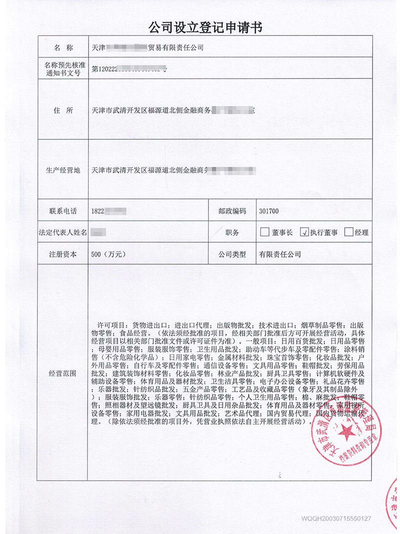 天津公司注冊(cè)成功后獲得的資料